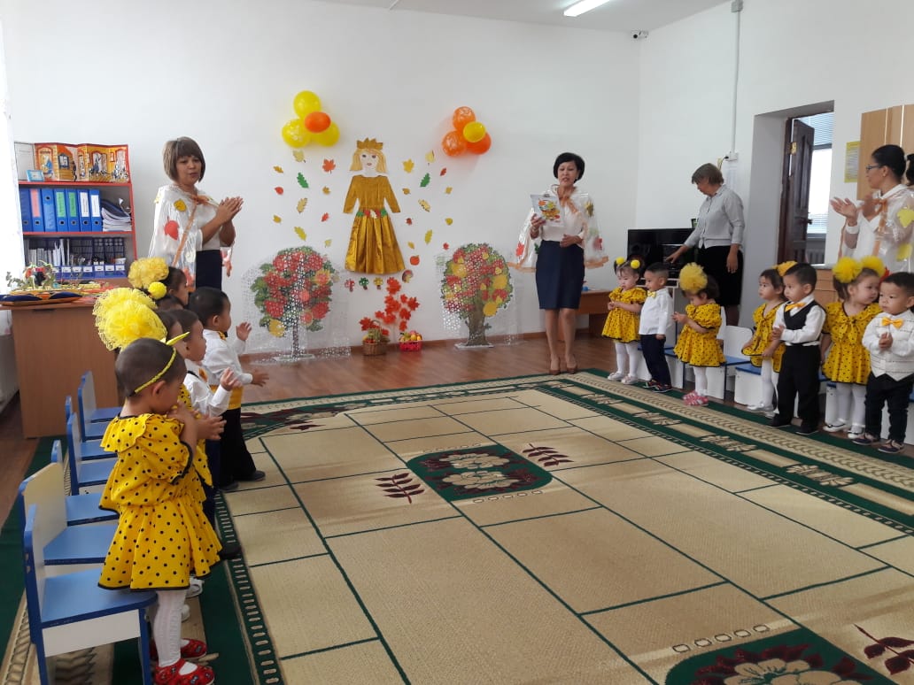 Қазан айында "Ортеке" І кіші тобында "Күзгі баққа қонаққа бару", "Сәйгүлік" І кіші тобында "Күзгі орманға қонаққа бару", "Нұржауған" ІІ кіші тобында "Жомарт күз", "Балапан" ІІ кіші тобында "Күз сыйы", "Таңшолпан" ортаңғы тобында "Берекелі, Алтын күз!" атты ойын-сауықтары болып өтті. Мақсаты: күз мезгілінің ерекшеліктерін ұғындыру. Күз өнімдерімен таныстыру, олардың ағзаға пайдасын түсіндіру. Мерекелік көңіл-күй орнату. Балаларды ән салуға, би билеуге, түрлі іс-әрекеттерге тарту, бейімділіктерін арттыру. Шығармашылық ой-қиялдарының дамуына ықпал ету. Ата-аналар қауымымен тығыз қарым-қатынас қалыптастыру.