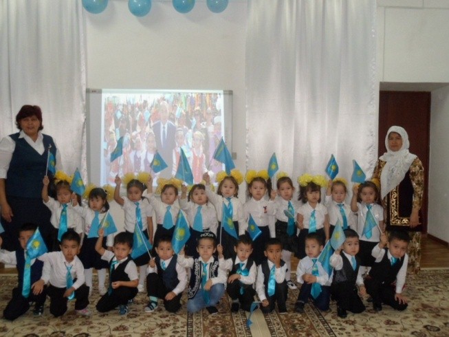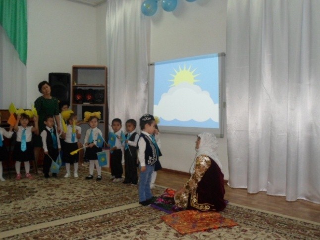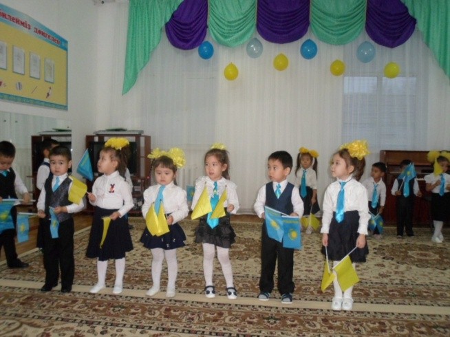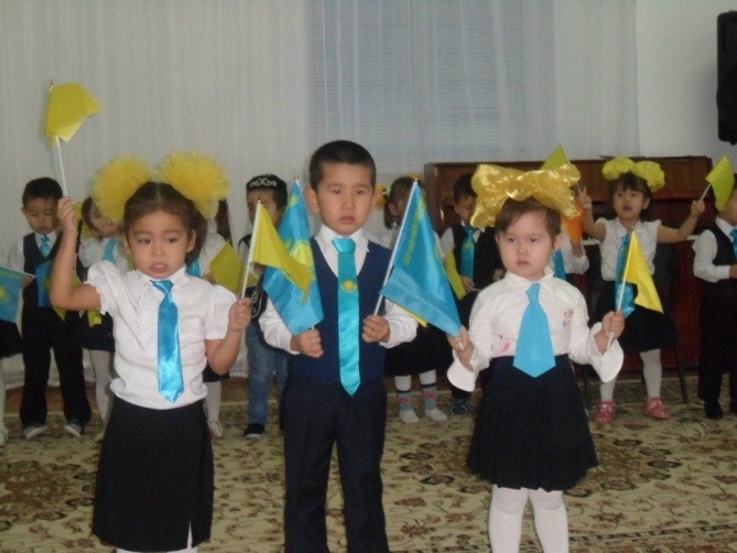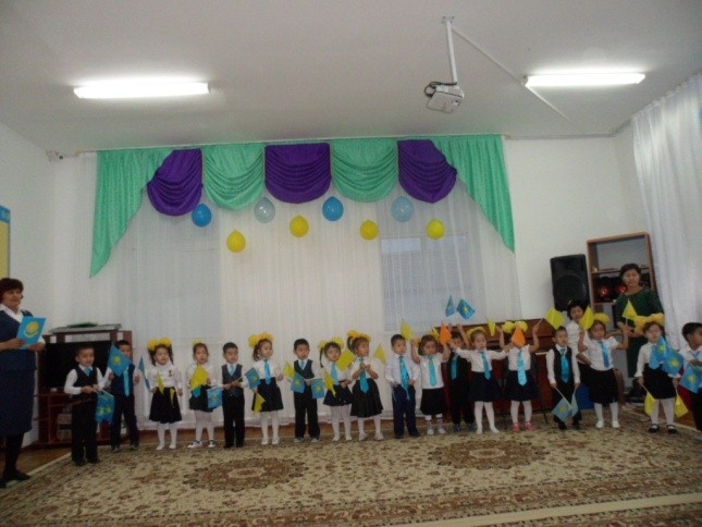 Ертеңгілік Мемлекеттік Әнұранды айтумен басталды. "Тәуелсіздіктің ақ таңы атып келеді!" атты көрінісінде әже немересіне: "Тәуелсіздік -деген еркіндігің, бостандығың, бақытың!",- деп түсіндірді. Балаларға батасын берді. Балалар мерекеге арнап Отан, Рәміздер туралы тақпақтарын және "Қазақстан бақыты" , "Атамекен" әндерін орындады. Отан туралы мақал-мәтелдер мен нақыл сөздер айтты. Соңында "Көк тудың желбірегені" әуеніне Флешмоб биледі.