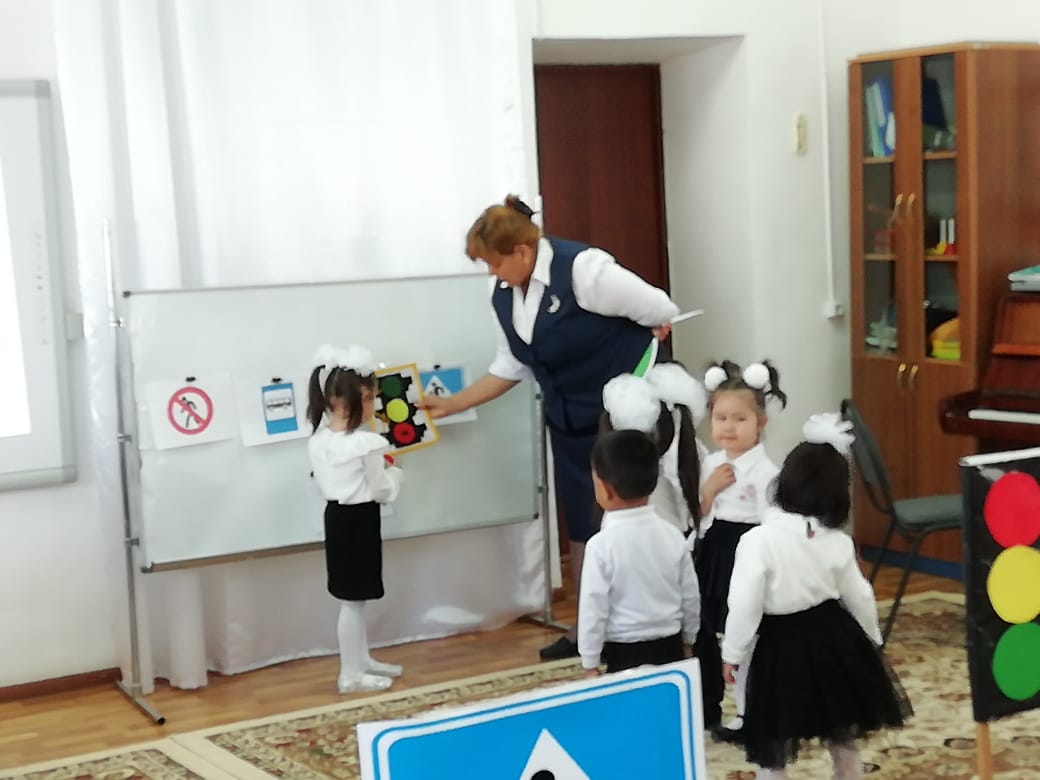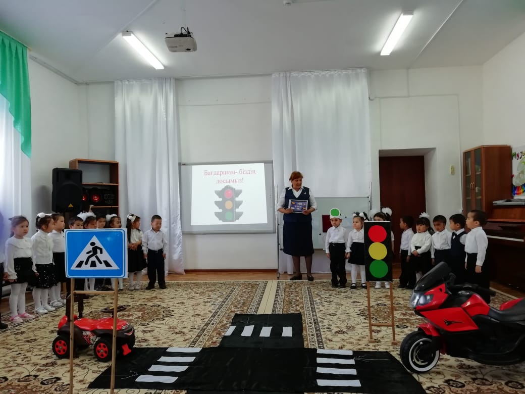 "Балапан" ІІ кіші тобында тәрбиеші Ғ.Бубитаеваның ұйымдастыруымен "Бағдаршам -біздің досымыз!" тақырыбында ойын-сауық өтті. Мақсаты: жолда жүру ережелерін есте сақтау, бағдаршам белгілерінің айырмашылығын жолда және көшедегі қауіпсіздік ережелері, жол белгілері туралы түсініктерін кеңейту.Балаларды жол жүру ережелерін сақтауға тәрбиелеу.