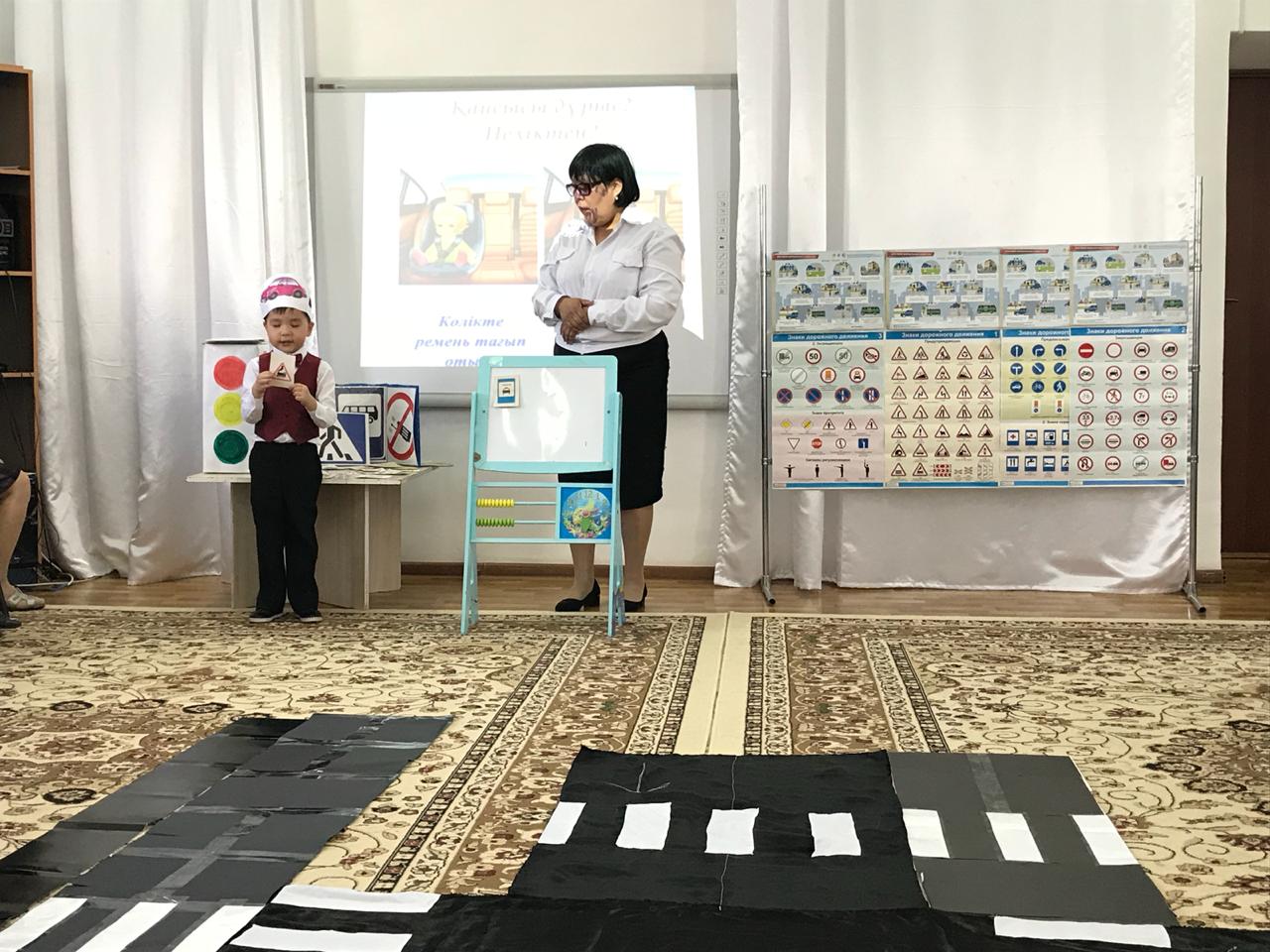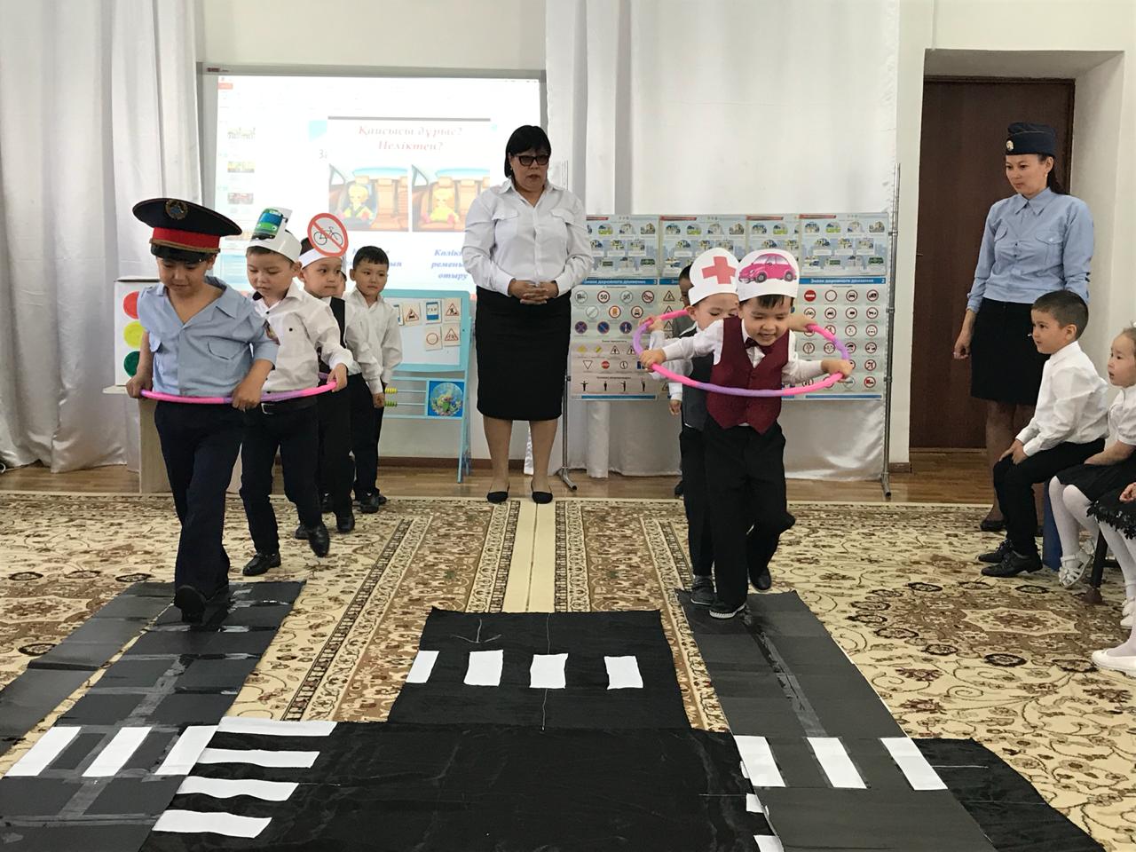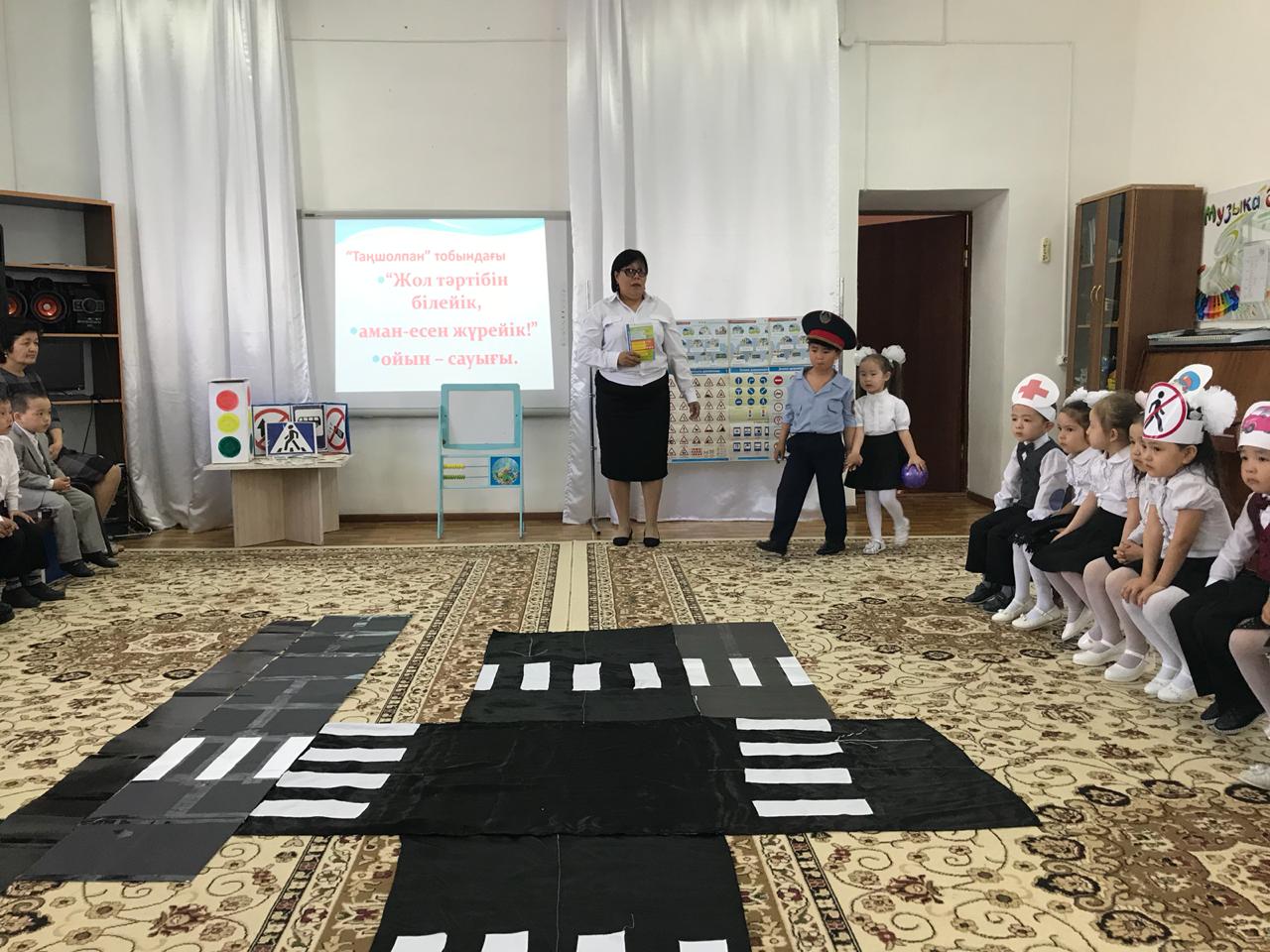 Ойын-сауықта балаларға жол ережелері, жол белгілері туралы слайдтар көрсетіліп түсіндірілді. МАЙ қызметкерлері балаларға жолда, көшеде жүрген кезде абай болып жүру туралы түсініктер берді. Балалар тақпақтар, әндер айтып, ойын ойнап кешті көңілді өткізді.Соңында тәрбиешісі балаларға ата-аналарымен бірге танысуға "Қауіпсіздік ережелерін білу, жарақаттанудан сақтайды!" делінген парақша таратты.