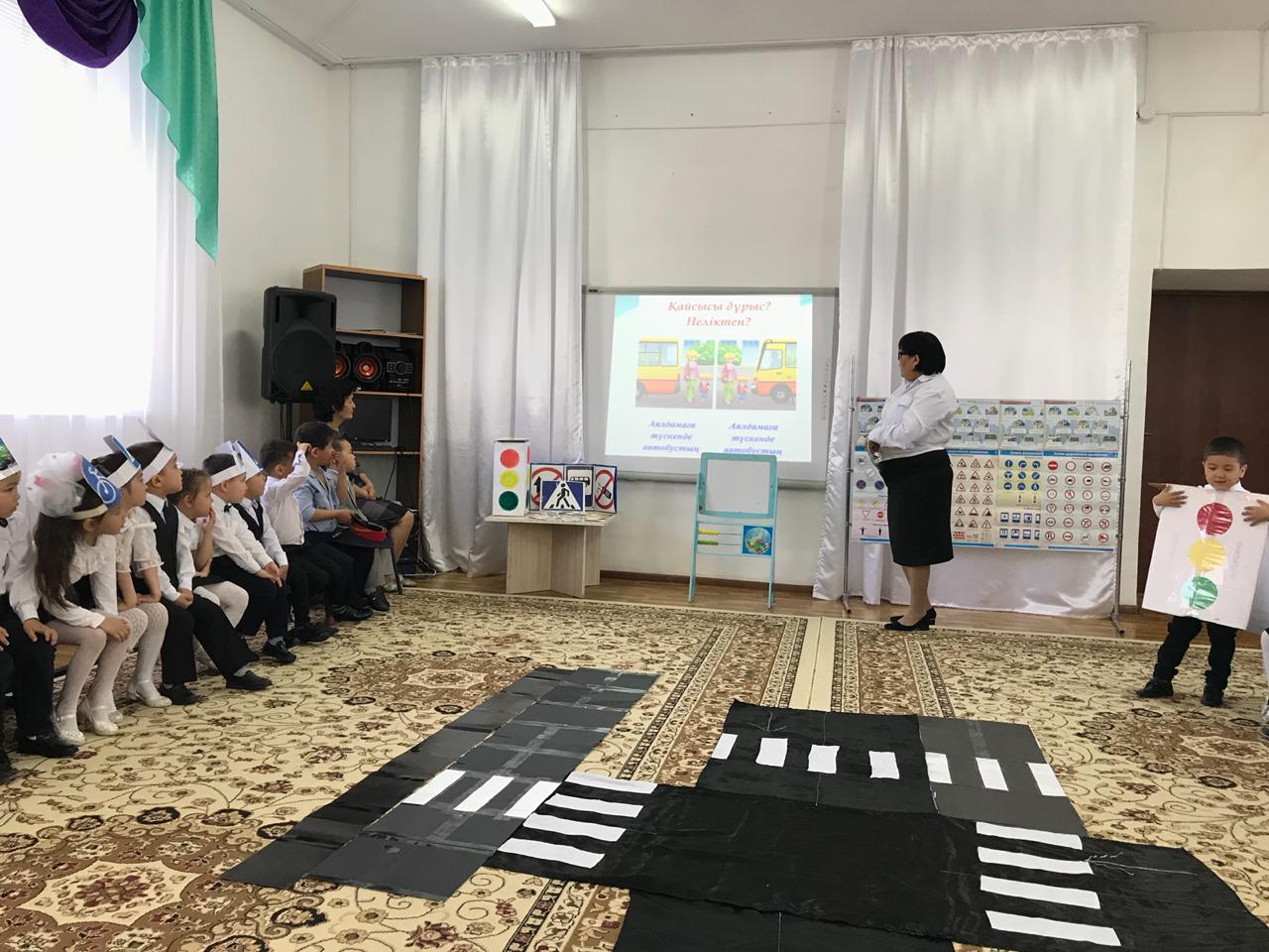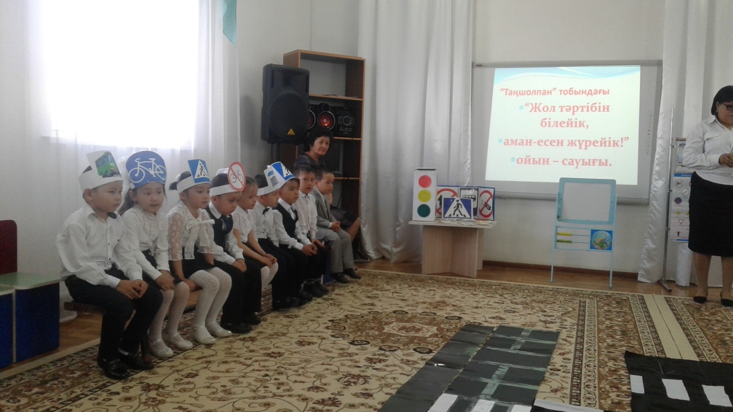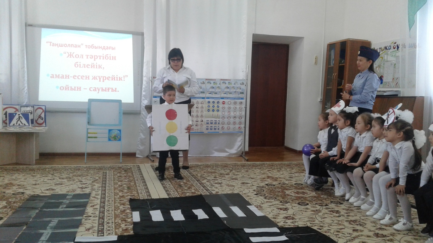 Ойын-сауықта балаларға жол ережелері, жол белгілері туралы слайдтар көрсетіліп түсіндірілді. МАЙ қызметкерлері балаларға жолда, көшеде жүрген кезде абай болып жүру туралы түсініктер берді. Балалар тақпақтар, әндер айтып, ойын ойнап кешті көңілді өткізді.Соңында тәрбиешісі балаларға ата-аналарымен бірге танысуға "Қауіпсіздік ережелерін білу, жарақаттанудан сақтайды!" делінген парақша таратты.