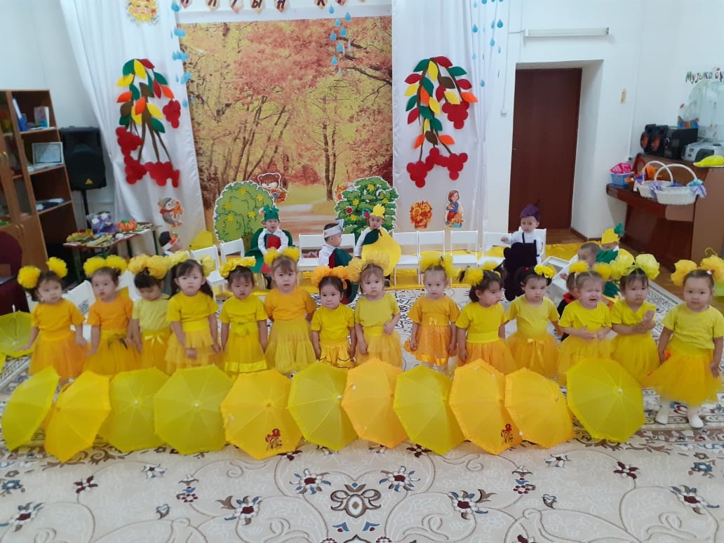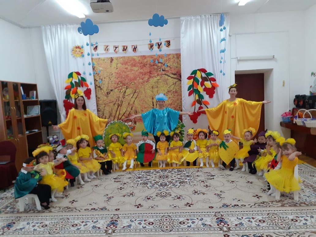 Мерекелік шараға Күз Ханшайымы, Бұлт келіп бүлдіршіндерге ойындар ойнатып , жақсы көңіл сыйлады. Бүлдіршіндеріміз әсем әуенмен "Тамшылар", "Күзгі жел" әндерін және ұл балаларымыз "Көкөністер", ал қыз балаларымыз- "Қолшатыр" билерін әдемі орындады. Балаларды өнерге баулу мақсатында берілген тапсырма бойынша ата-анамен бірлесе жасаған "Күзгі" көрмелерін мадақтап , ата-аналарға диплом берілді. Осы ертеңгілігіміздің жақсы өтуіне көмектескен ата-аналарымызға және балаларымызға рахмет айтамыз.