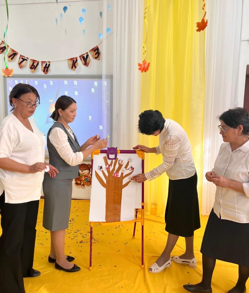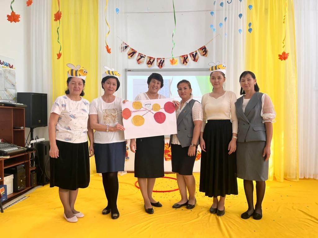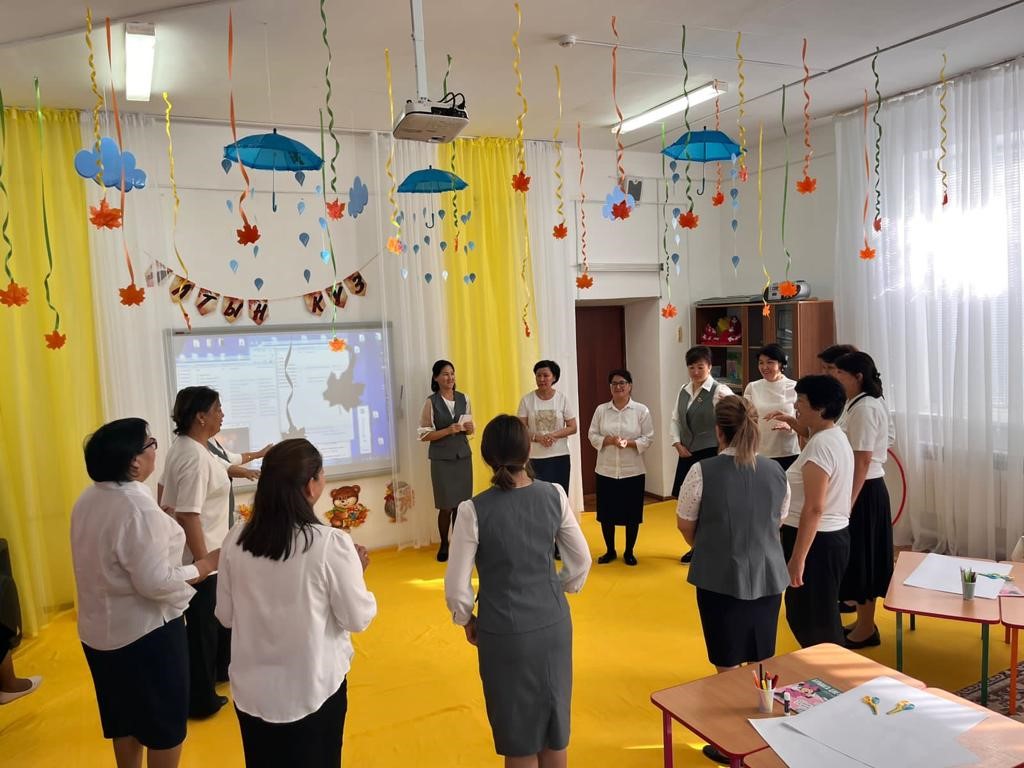 Күн тәртібінде: 11.09.2023-21.09.2023ж. күндер аралығында ҚР Оқу- ағарту министрлігі “Өрлеу” біліктілікті арттыру ұлттық орталығынан кәсіби деңгейін шыңдау мақсатында әріптесіміз Күнсұлу Орынбасарованың іс- тәжірибесімен, алған ақпараттарымен бөлісу. Күнсұлу Коблановна “Мектепке дейінгі білім беру ұйымдары педагогтерінің ойын құзыреттілігін дамыту” тақырыбын баяндай отырып, топтау әдісімен педагогтарды: кіші, орта және ересек топтарға топтастырды. Бес дағдыны кірістіріп қимылдық ойын ұйымдастыру тапсырмасы берілді. Әр топ өз деңгейлеріне қарай қимылдық ойындарды қызықты әрі тартымды қылып ұйымдастыра білді және қорғап шықты. Педагогтер алған әсерлерімен бөлісіп, бөбекжай әдіскері Ақжүніс Қисақызы қорытындылады.